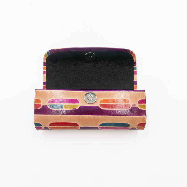 Deze gekleurde leren brillenkoker heeft een ontwerp met verschillende kleurvlakken, wat zorgt voor een speelse en unieke uitstraling. De brillenkoker beschermt je bril tegen krassen en lichte beschadigingen en is geschikt voor verschillende soorten brillen, zoals leesbrillen of zonnebrillen. Door het compacte formaat past de brillenkoker gemakkelijk in een tas of jaszak.